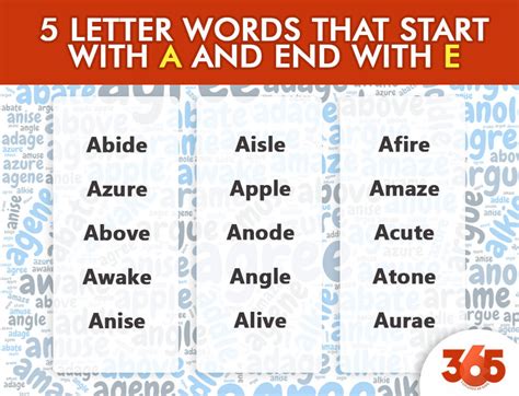 Words That Start With A And End With E. Axle 5 letter words starting with a and ending in e. Found 496 words that start with a and end with e.